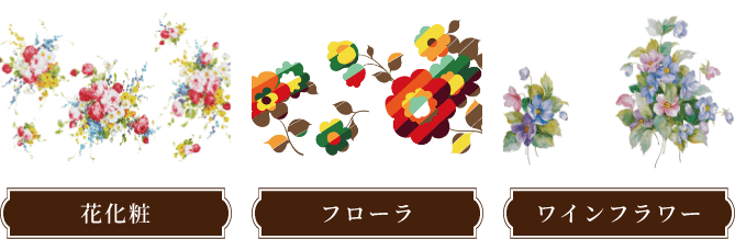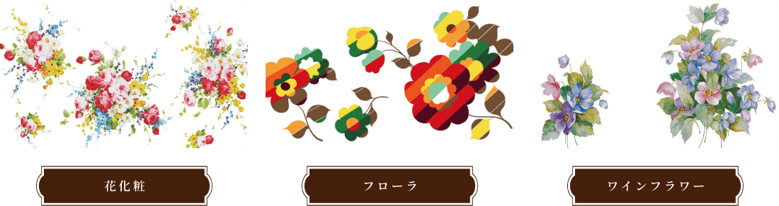 色とりどりの花を散りばめたブーケが舞う『花化粧』は、1968年に登場したデザイン。乙女心をくすぐる、華やかで繊細なタッチが魅力です。