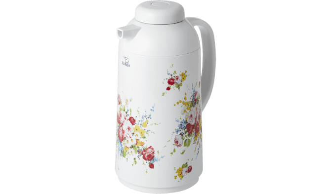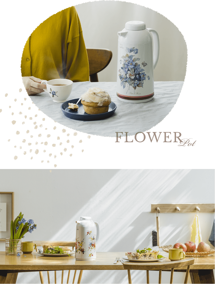1968年に登場した『花化粧』デザインのポット。色とりどりの花を散りばめたブーケが、キッチン&ダイニングを明るく華やかに彩ります。